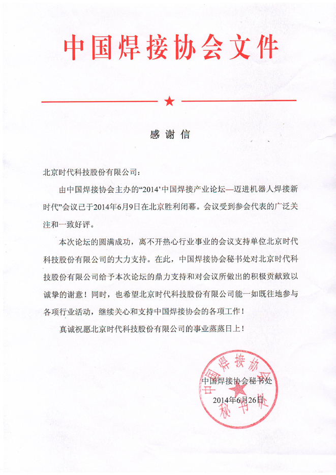 中國焊接協(xié)會(huì )感謝信