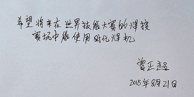 從第41屆世界技能大賽開(kāi)始,焊接項目的培訓和選拔賽一直使用北京時(shí)代的電焊機?!皶r(shí)代焊機,中國品牌”,“時(shí)代焊機,國賽用機”,歷屆大賽選手對時(shí)代焊機非常熟悉,對時(shí)代產(chǎn)品具有特殊的感情。在第43屆世界技能大賽巴西比賽現場(chǎng),舉辦方選用的是美國林肯焊機。曾正超和周樹(shù)春教練結合比賽期間的現場(chǎng)感受,和時(shí)代團隊溝通了時(shí)代焊機和國外品牌產(chǎn)品的性能對比和差異,對代表中國品牌的時(shí)代焊機的發(fā)展提出期望,世界冠軍曾正超親筆題寫(xiě):“希望將來(lái)在世界技能大賽的焊接賽場(chǎng)中能使用時(shí)代焊機”。